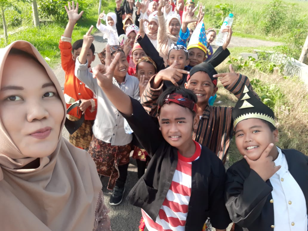 Murid murid sekolah dasar negeri (SDN) 2 Kalimati dan sekolah taman kanak kanak (TK) juga merasakan senang dan gembira jalan kaki dan di sertai dranbenan keliling ,