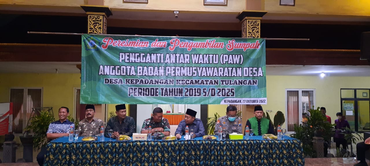 Ankasapost.id Sidoarjo – Koramil 0816/05 Tulangan – Peltu Lukman Nurhakim Babinsa Koramil 05/Tulangan Kodim 0816/SDA bersama Forkopimka beserta Jajaran menghadiri acara pelantikan dan pengambilan sumpah/janji Pengganti Antar Waktu (PAW) anggota Badan Permusyawaratan Desa (BPD), tempat kegiatan di Balai Desa Kepadangan , Kecamatan Tulangan, kabupaten Sidoarjo, Kamis malam (27/10/2022).