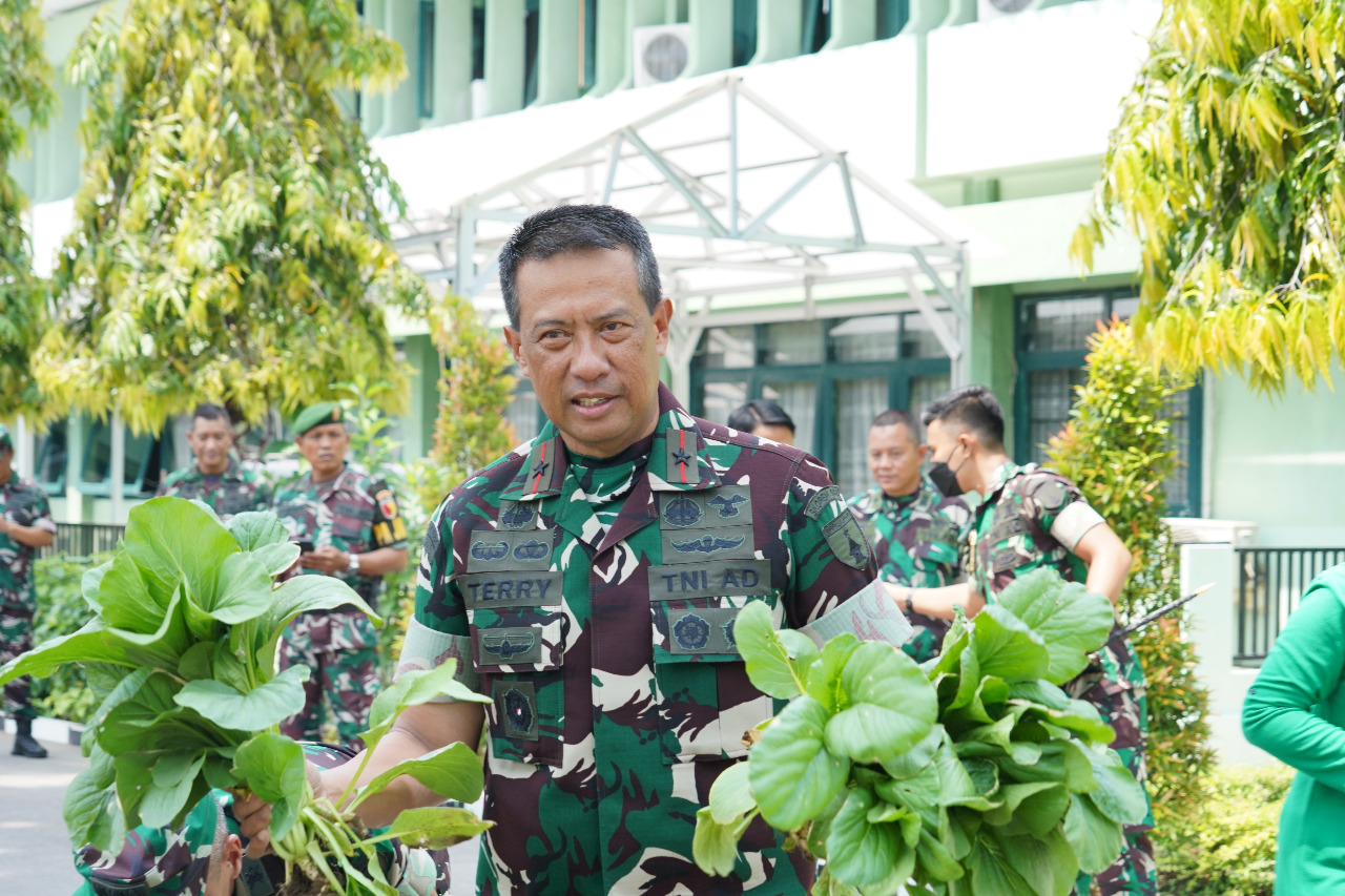 ankasapost.id SURABAYA – Prajurit, PNS dan juga Persit Korem 084/BJ bersama Danrem Brigjen TNI Terry Tresna Purnama, S.I.Kom., M.M. dan Ketua Persit KCK Koorcab Rem 084 kembali memanen sayuran hasil pengembangan menggunakan teknologi Akuaponik yang diaplikasikan di sekitar kantor Makorem 084/BJ Jalan A. Yani No 1 Surabaya, Senin (31/10/2022).