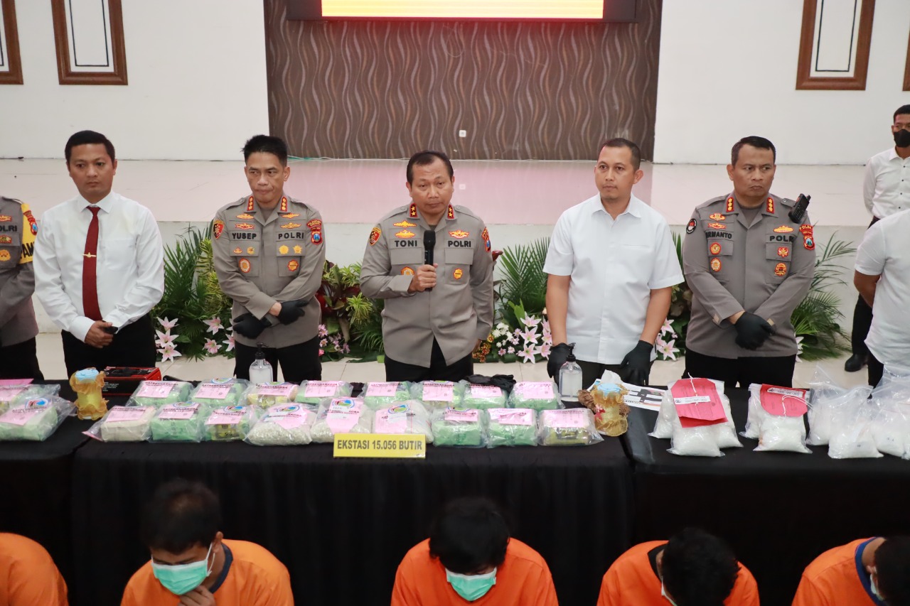 Polres Jombang Polda Jatim Ankasapost.id *Surabaya* – Polda Jatim berkolaborasi dengan Polrestabes Surabaya Surabaya, berhasil menggagalkan narkotika jenis sabu-sabu sebanyak 36 kilogram dan 15 ribu ekstasi dengan tersangka total tujuh orang yang diperkirakan berasal dari jaringan Internasional.