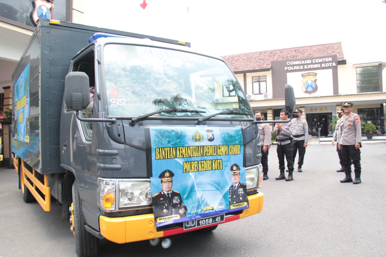 Pemberangkatan dua truck berisi sembako dan obat obatan serta selimut ke Cianjur, diberangkatkan secara langsung oleh Kapolres Kediri Kota AKBP Wahyudi, S.I.K., M.H serta Wakapolres Kediri Kota dan pejabat utama (PJU).