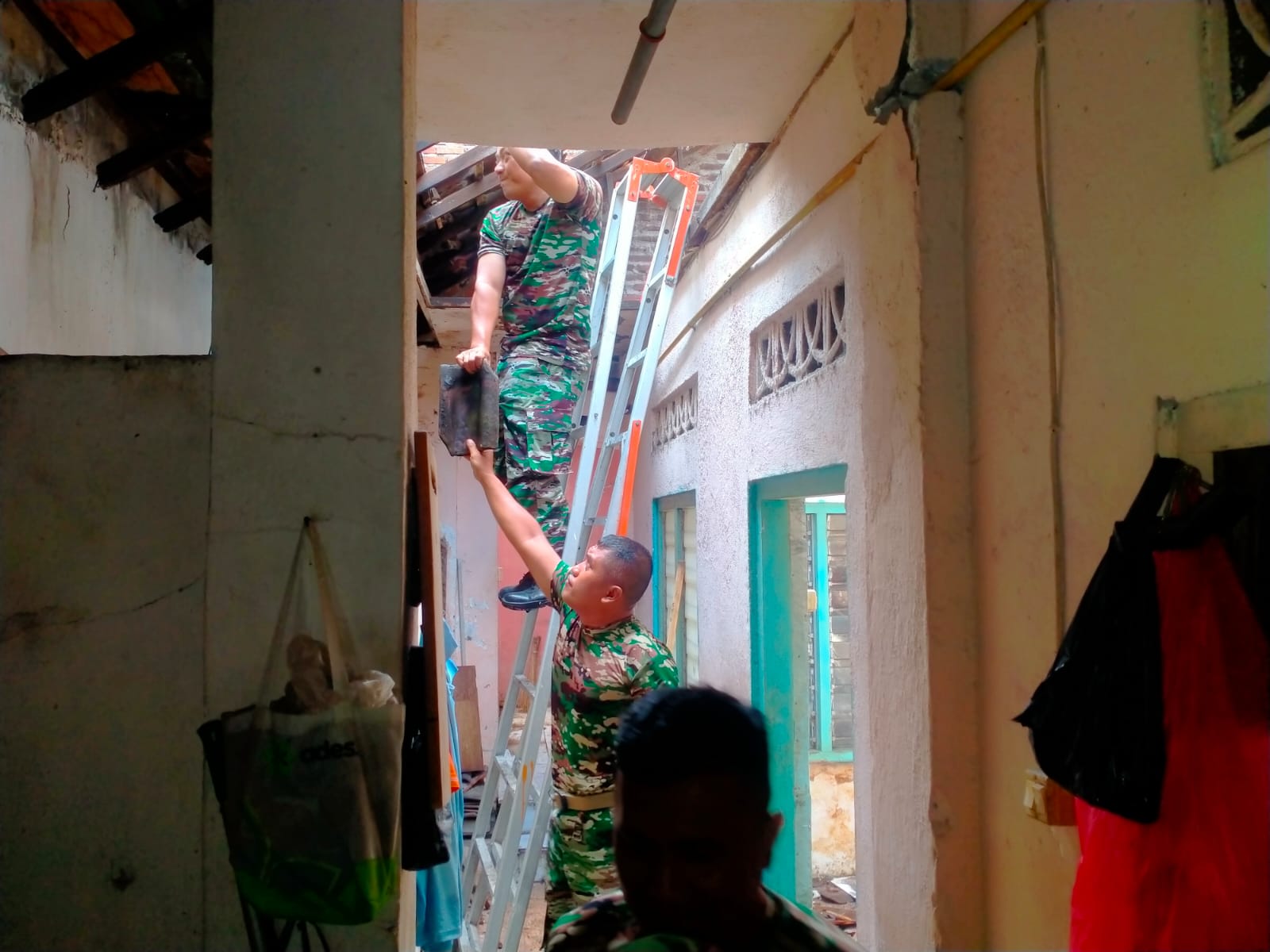 Sertu Tusanto anggota Koramil 0831/03 Gubeng kali ini membantu warga dalam perehaban rumah milik Bapak Cucuk (46 th) alamat Gubeng Kertajaya no 26 RT/RW 5/5 Kelurahan Airlangga Kec Gubeng Surabaya, sabtu ,(26/11/22).