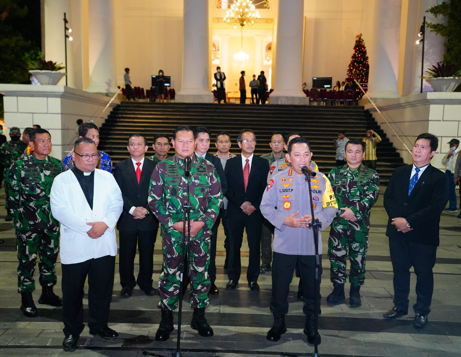 “Saya mengucapkan selamat Natal 2022 dan selamat Tahun Baru 2023, bagi seluruh umat Kristiani. Dan kami TNI-Polri siap mengawal dan mengamankan agar situasi Nataru dapat berjalan aman dan lancar sesuai arahan Bapak Presiden,” ucap Sigit.