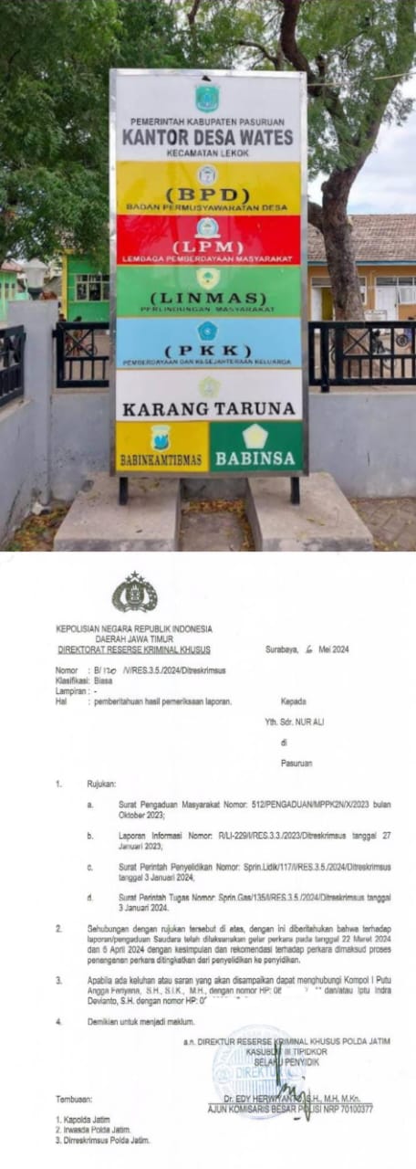 Diberitakan sebelumnya, Kepala Desa (Kades) Wates, Kecamatan Lekok, Kabupaten Pasuruan berinisial M. yang telah DILAPORKAN masyarakat ke Ditreskrimsus Polda Jatim tanggal 3 Januari 2023 dengan Laporan Informasi sebagai Pengaduan Masyarakat (DuMas) Nomor:R/LI-229/RES.3.3/2023.