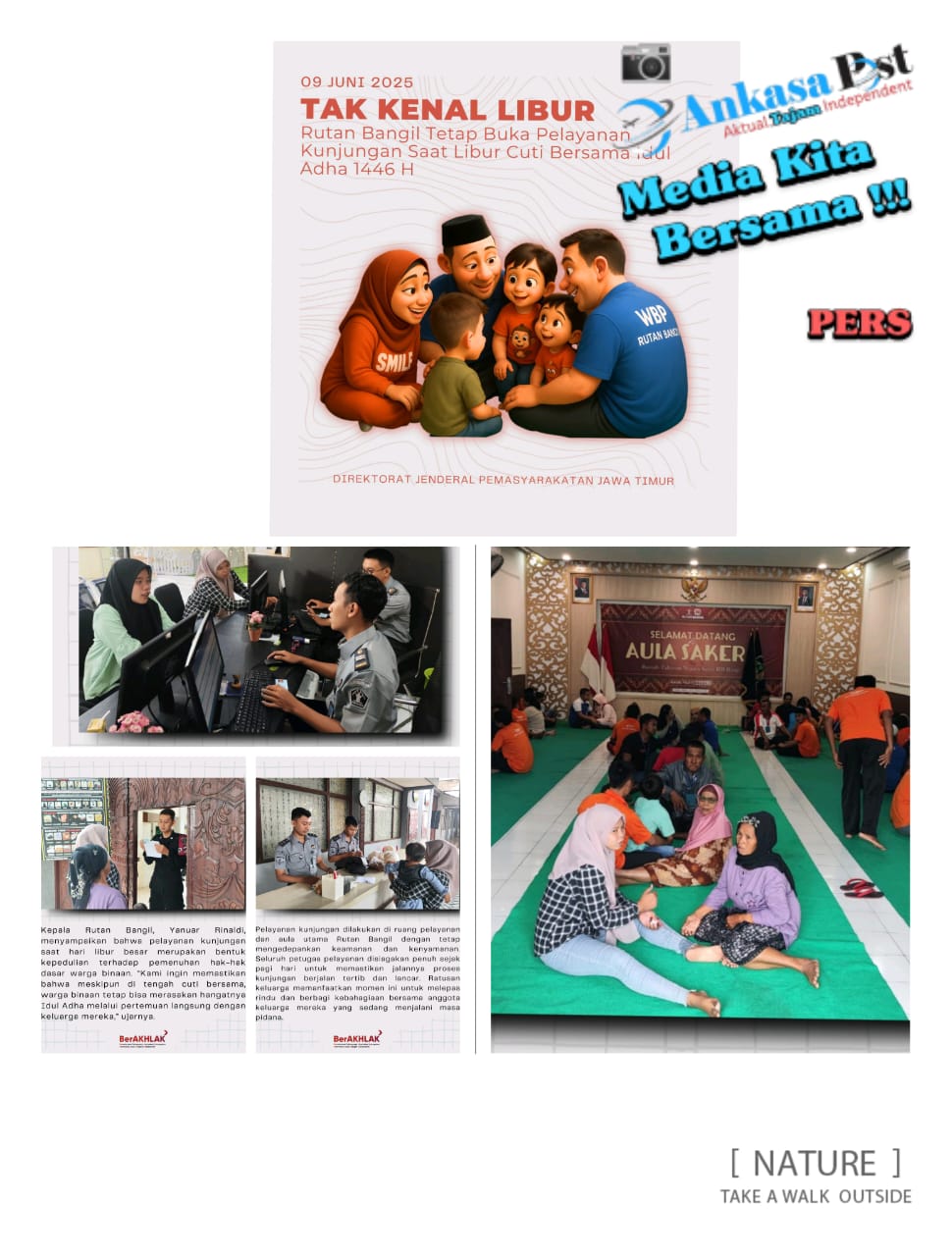 Pasuruan, Ankasapost.Id – Rumah Tahanan Negara (Rutan) Kelas IIB Bangil tetap membuka pelayanan kunjungan bagi keluarga warga binaan di tengah hari cuti bersama Idul Adha 1446 H. Keputusan ini diambil sebagai bentuk komitmen untuk menjaga hak-hak warga binaan sekaligus memberikan ruang silaturahmi di hari raya bersama keluarga tercinta, Senin (09/06).