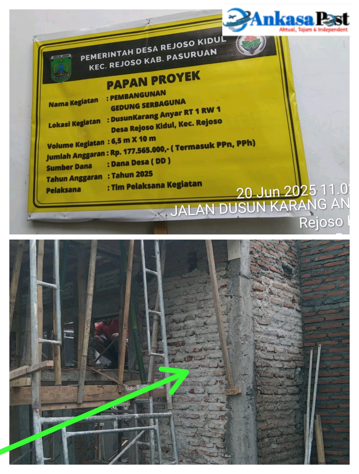 Pasuruan // Ankasapost.Id – Pelaksanaan Pembangunan Gedung Serba Guna di RT 01/ RW 01 Dusun Karanganyar Desa Rejoso Kidul Kecamatan Rejoso, yang bersumber dari Dana Desa (DD) tahun 2025 dengan nominal Rp 177.565.000, diduga kuat telah dimanipulasi dan di Mark Up oleh oknum Kades dan juga TPK (Tim Pelaksana Kegiatan) pembangunan gedung tersebut, sudah jelas bangunan bekas Gedung PKK disulap jadi Gedung Serba guna.