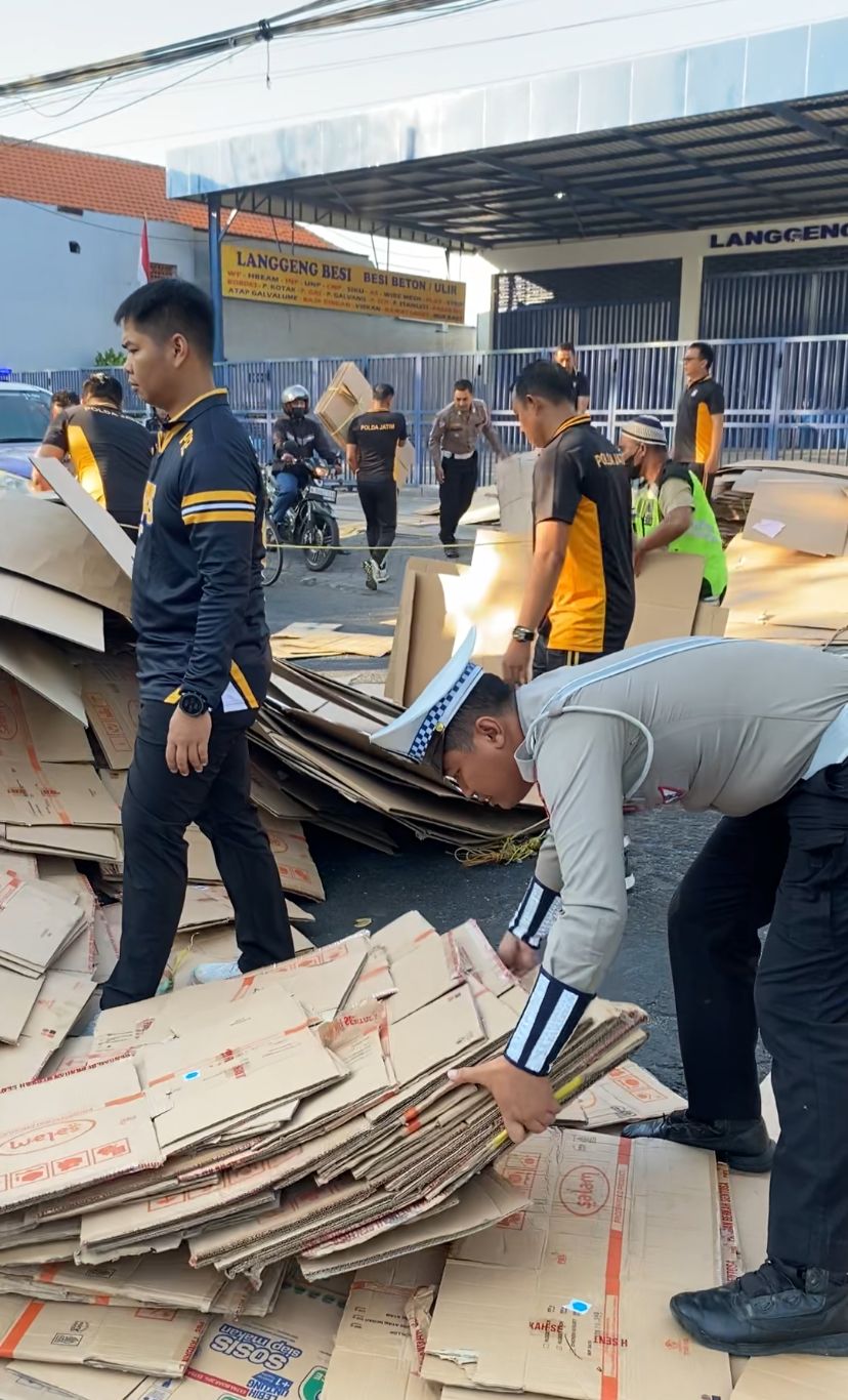 PASURUAN,AnkasaPost.Id- Satlantas Polres Pasuruan bergerak cepat mengevakuasi kendaraan pick-up bermuatan kardus yang mengalami kecelakaan di Simpang Empat Gudang Garam, Bangil, Jumat pagi, (1/8/25).