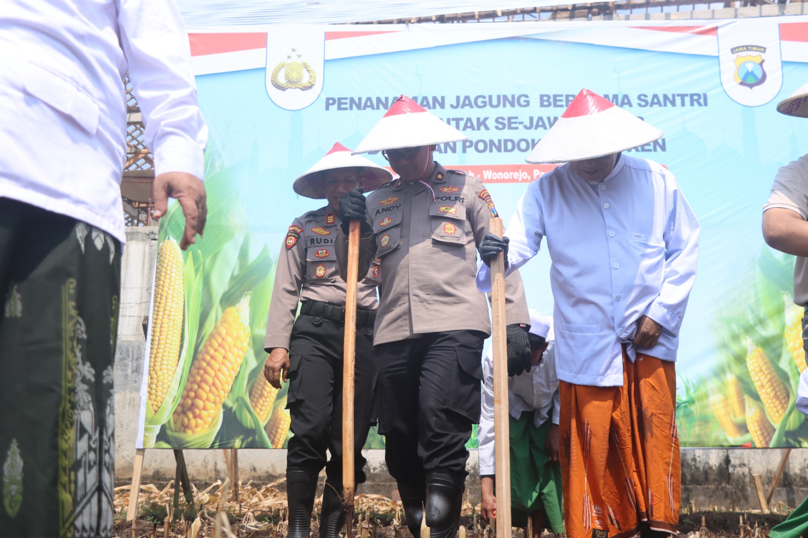 Usai kegiatan virtual, Polres Pasuruan menyerahkan bantuan pertanian kepada pihak pesantren, dilanjutkan dengan penanaman jagung secara langsung di lahan seluas beberapa hektar milik Ponpes Sabilunnajah.