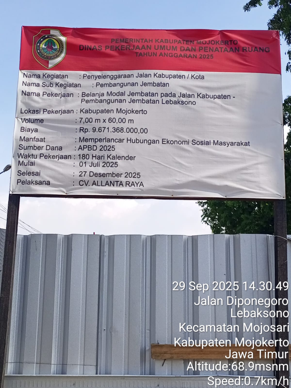 Mojokerto,Ankasapost.Id 29 September 2025 – Proses pembangunan jembatan strategis yang berlokasi di Desa Lebaksono, Kabupaten Mojokerto resmi berjalan sejak tanggal 1 Juli 2025. Pekerjaan ini merupakan bagian dari program Penyelenggaraan Jalan Kabupaten/Kota, dengan sub kegiatan Pembangunan Jembatan, yang dibiayai melalui Anggaran Pendapatan dan Belanja Daerah (APBD) Tahun 2025, dengan total biaya sebesar Rp 9.671.368.000,00.