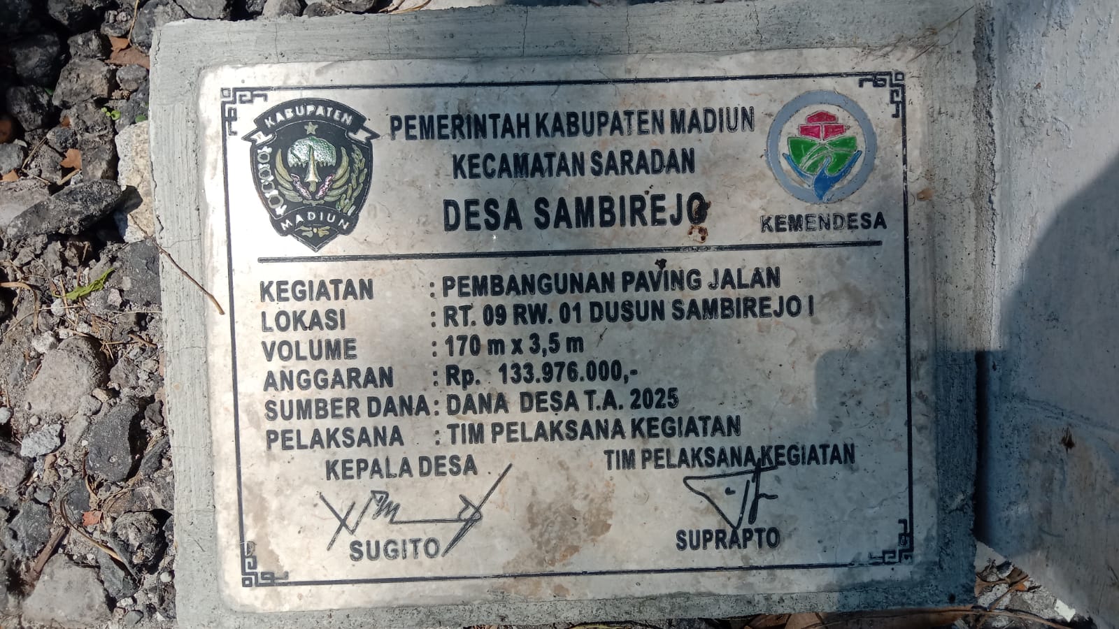 “Volume pekerjaan 170 meter x 3,5 meter. Anggaran Dana yang bersumber dari Dana Desa (DD) tahun 2025 sebesar Rp133.976.000,” terang Kepala Desa Sambirejo , Sugito kepada awak media ,kamis (9/10/2025).