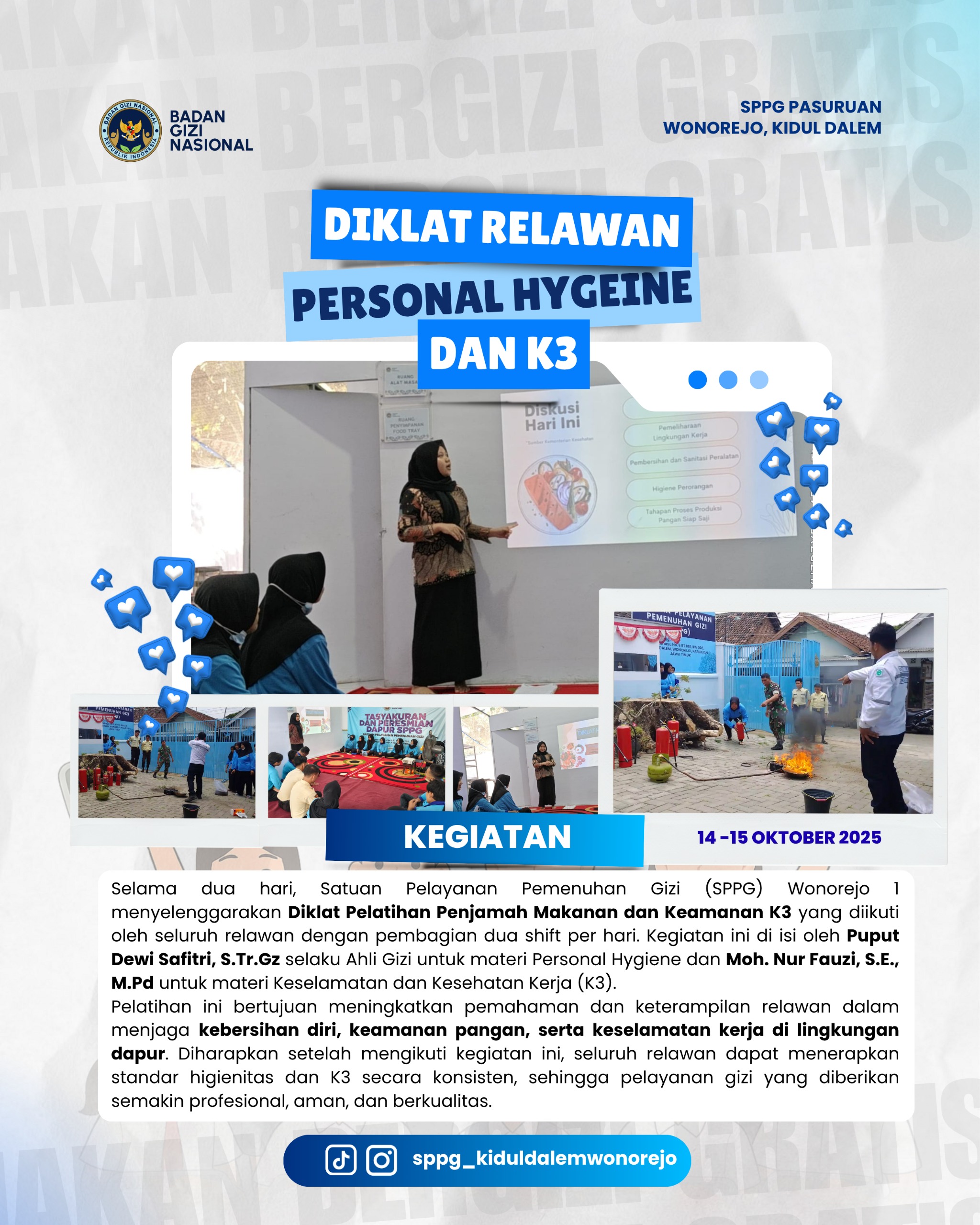 SPPG Wonorejo 1 dusun Kidul dalem menyelenggarakan Diklat Penjamah Makanan dan Keamanan K3, yang diikuti oleh 47 relawan dengan pembagian dua shift per hari. Kegiatan ini menghadirkan narasumber Puput Dewi Safitri, S.Tr.Gz