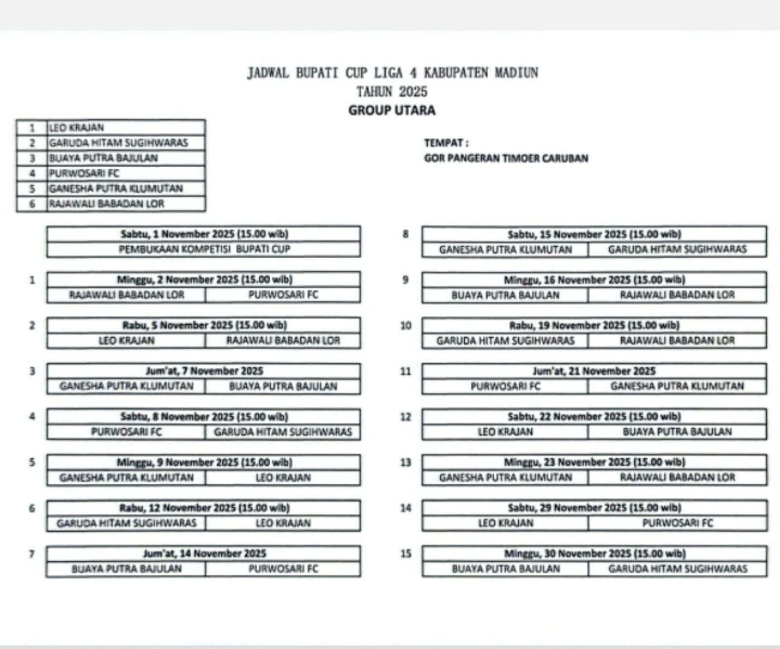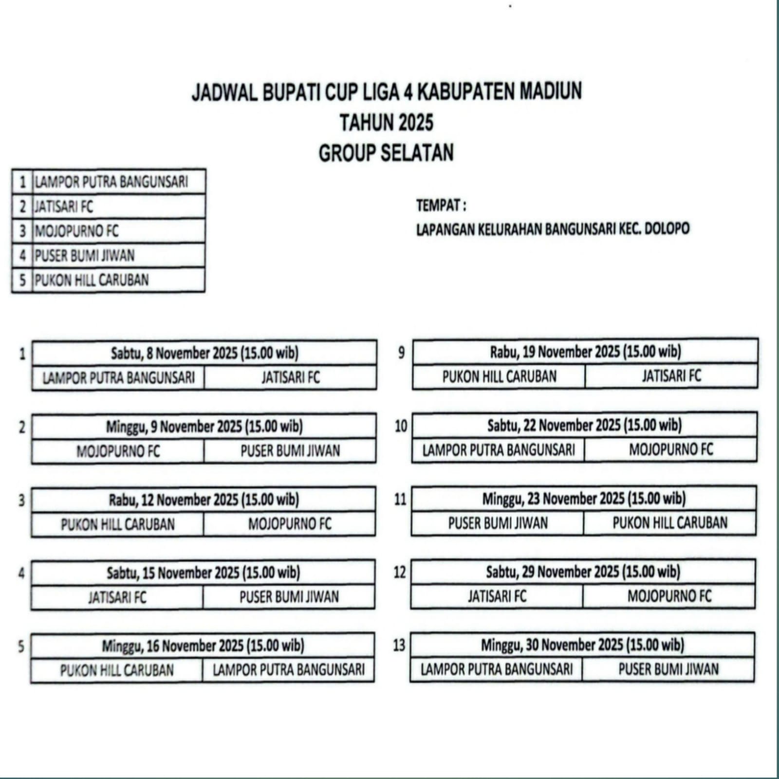 Sementara itu Kasi Olahraga Prestasi Disparpora Gatot Sulistyo, S.Sos, M.Si, Menyampaikan kepada awak jadwal pertandingan Bupati Cup Liga 4 tahun 2025 Ada dua tempat.