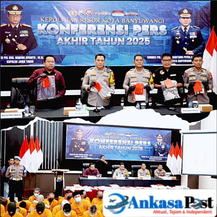 Banyuwangi, – Ankasapost.Id // Kepolisian Resor Kota (Polresta) Banyuwangi mencatat kenaikan jumlah laporan polisi sebesar 16 persen sepanjang tahun 2025, namun di saat yang sama berhasil meningkatkan kinerja penyelesaian perkara secara signifikan. Hal tersebut disampaikan langsung oleh Kapolresta Banyuwangi Kombes Pol. Dr. Rama Samtama Putra, S.I.K., M.Si., M.H. dalam Konferensi Pers Akhir Tahun 2025 di Mapolresta Banyuwangi, Selasa (30/12/2025).