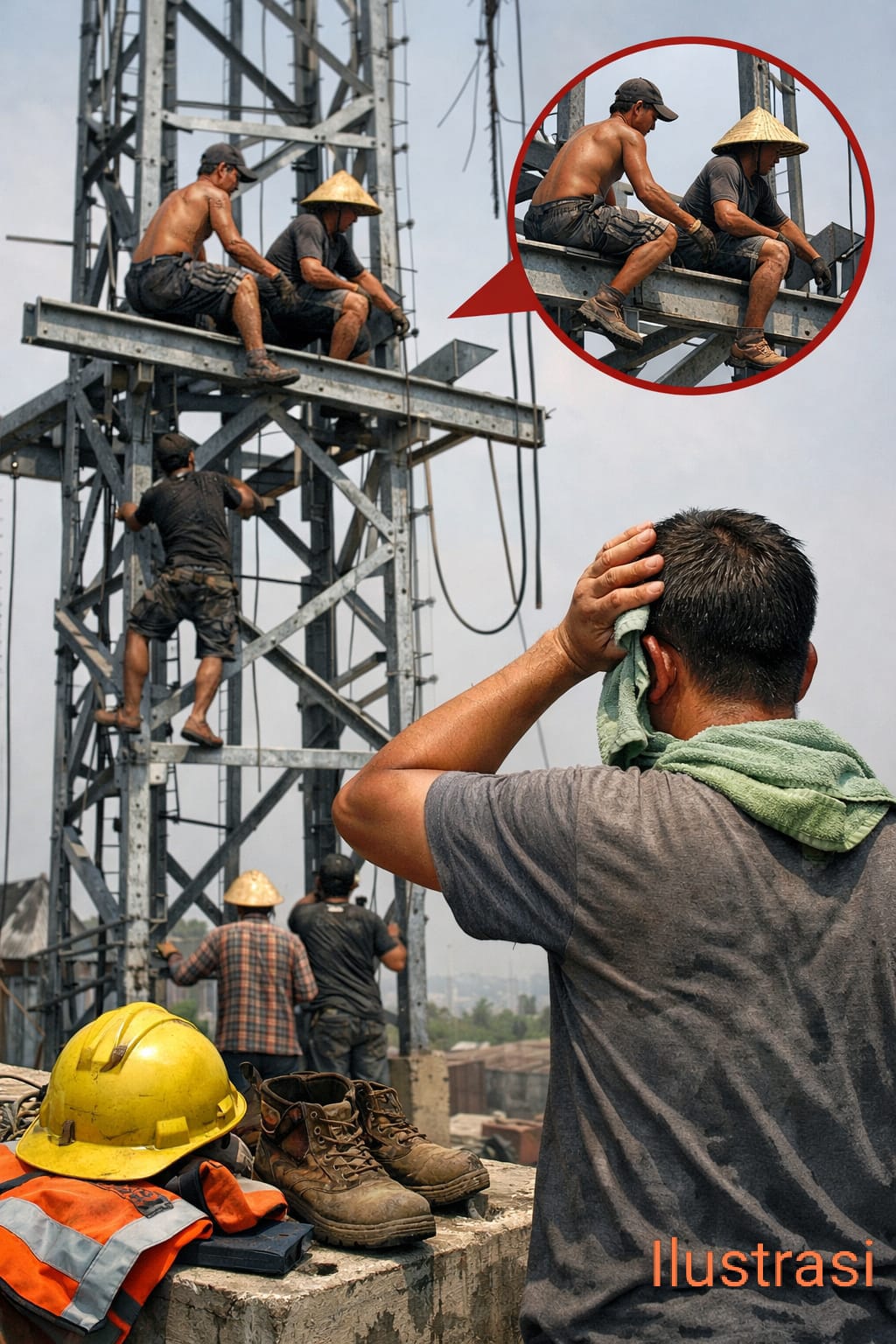 Menurut keterangan salah satu pekerja pembangunan tower itu juga mengatakan ,”sumuk mas bila pakai Rompi” sesuai investigasi awak media dan tim sebagai berikut tidak pakai helm, tidak ada harnes, tidak pakai rompi, tidak pakai sepatu, tidak pakai masker, tidak pakai sarung tangan”, ujar pekerja tersebut.