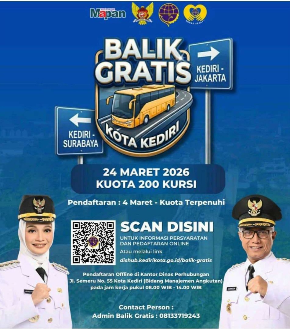 ANKASAPOST.ID-Kota Kediri – Program rutin mudik balik gratis pada momentum Lebaran 2026 kembali dibuka untuk masyarakat Kota Kediri. Tahun ini, Dinas Perhubungan Kota Kediri menyediakan total 200 kursi dengan dua rute tujuan, yakni Kediri-Jakarta dan Kediri-Surabaya.