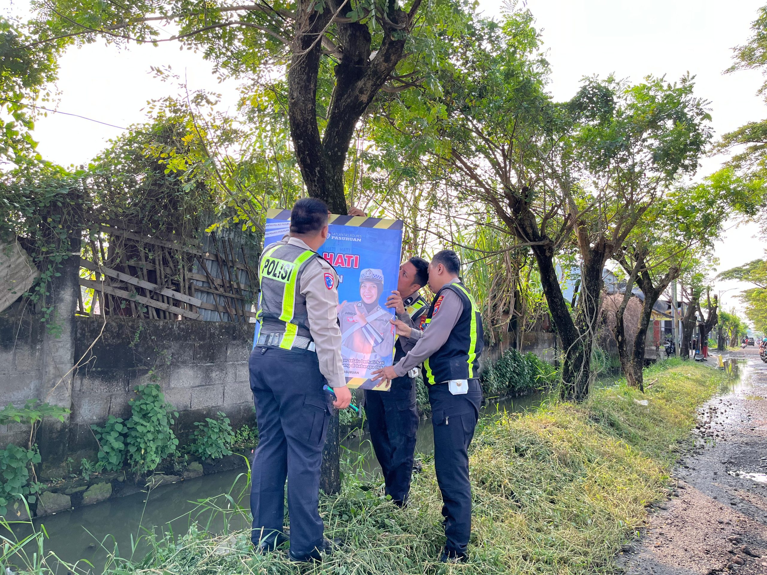 Pasuruan//Ankasapost.Id – Satuan Lalu Lintas (Satlantas) Polres Pasuruan mengambil langkah preventif guna menekan angka kecelakaan lalu lintas akibat infrastruktur jalan yang rusak. Personel kepolisian memasang sejumlah banner imbauan di sepanjang ruas jalan Glanggang – Kedungboto, Kecamatan Beji, Kabupaten Pasuruan.