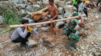 Gotong – royong Polres Trenggalek Bersama TNI dan Warga Bangun Tanggul Sungai Antisipasi Banjir Susulan